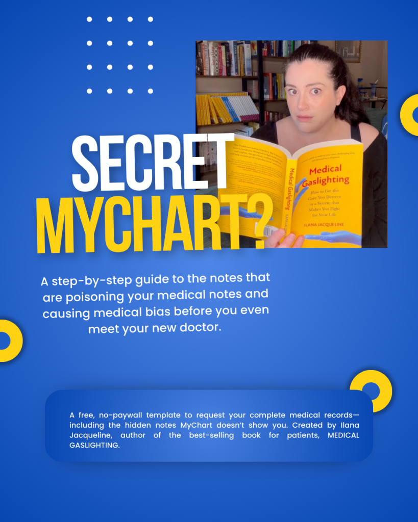 A free, no-paywall template to request your complete medical records—including the hidden notes MyChart doesn’t show you. Created by Ilana Jacqueline, author of the best-selling book for patients, MEDICAL GASLIGHTING.